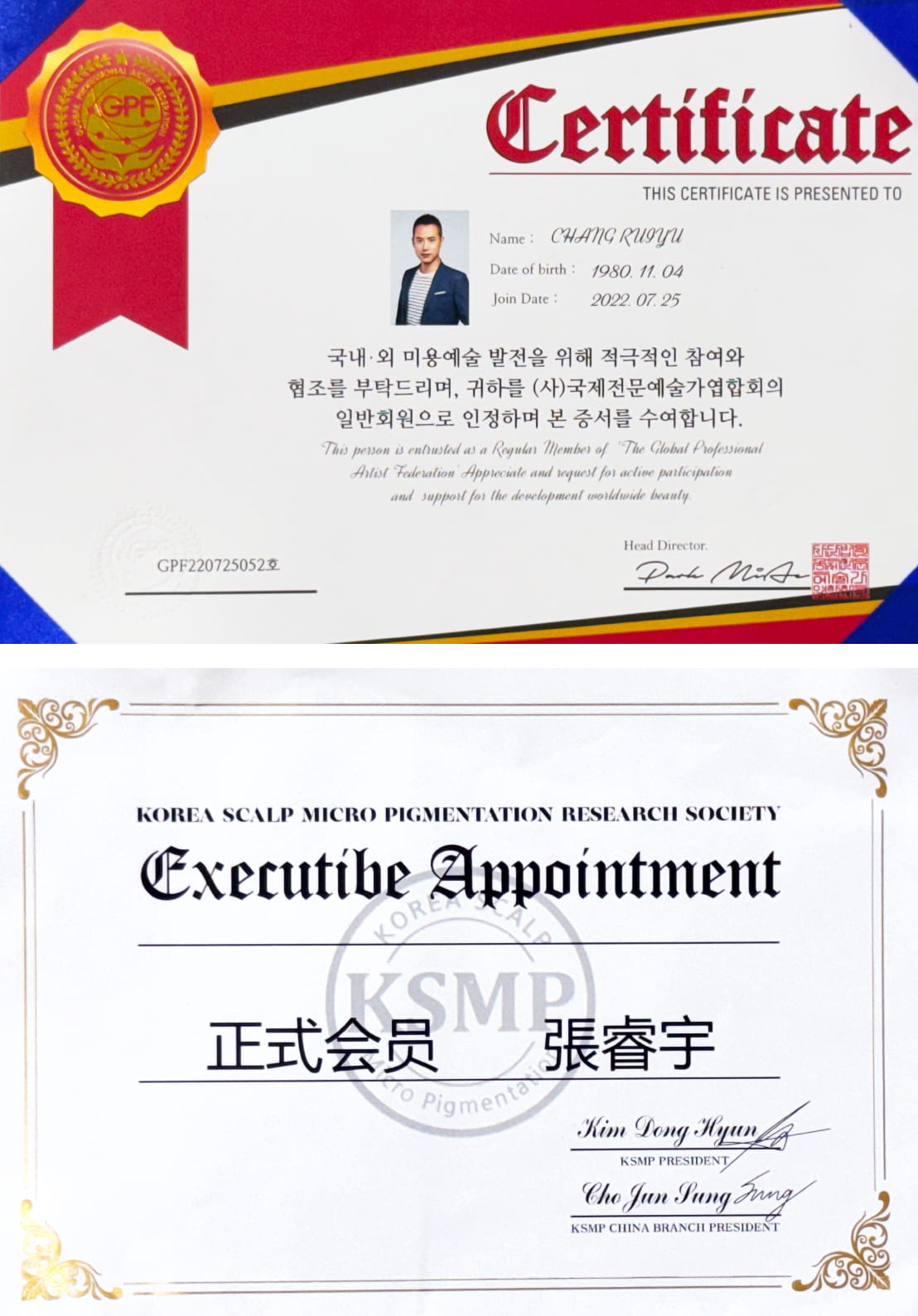 為了確保技術的正統性,張老師親赴韓國,師承韓國兩大頂尖紋髮協會—KSMP 與 KartSMP,並取得韓國協會「副會長」認證資格。